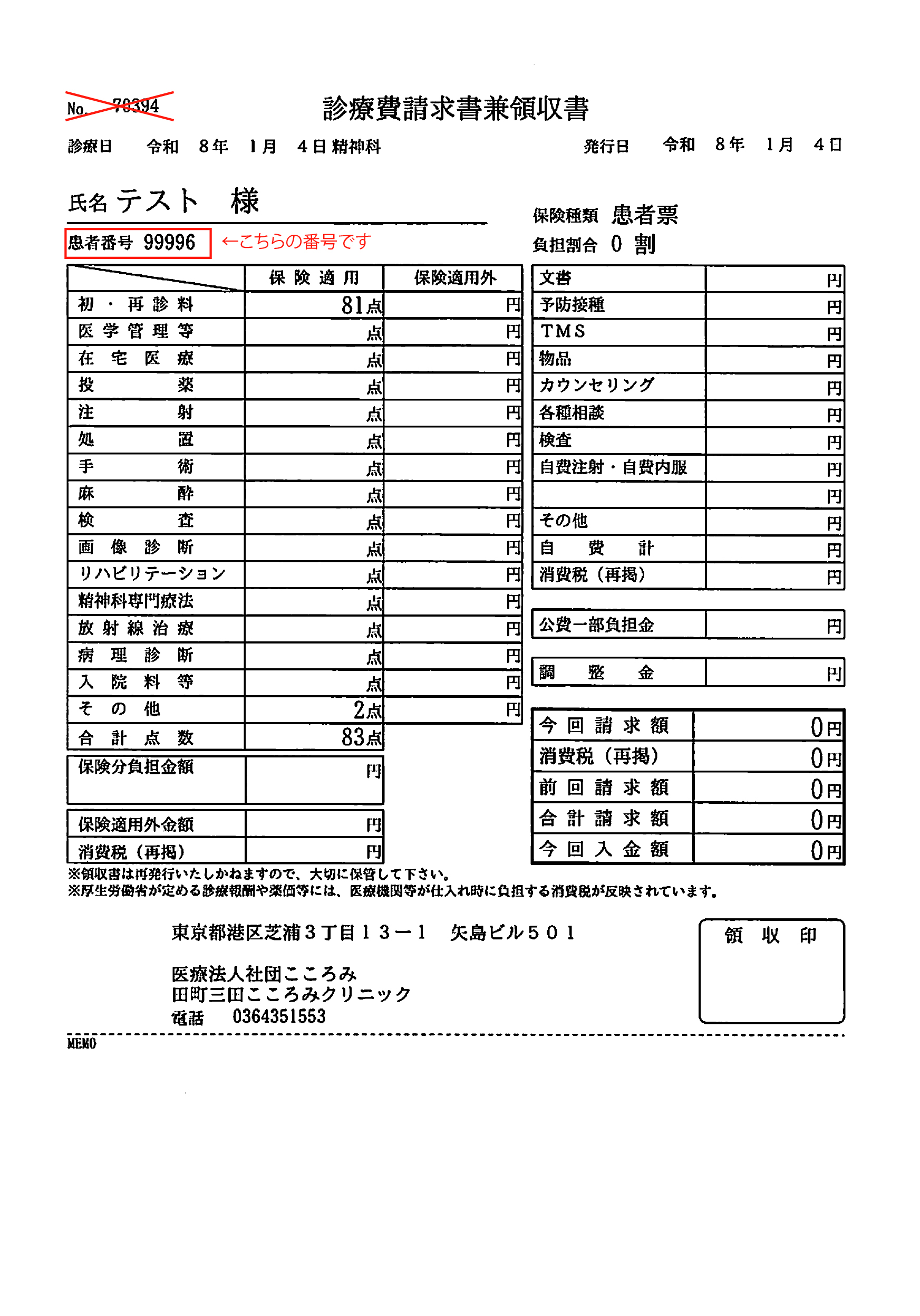 領収書左上の氏名欄の下(赤枠部分)に診察券番号が印字されています。